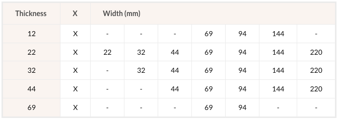 | Thickness | X | Width (mm) | ||||||